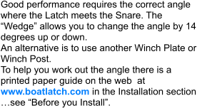 Note:- Installation & Use of the L & R Products The products need to be installed, and used, in accordance with the printed instructions on the packaging, printed inserts and the information published on the website www.boatlatch.com. Release & Retrieve takes no responsibility for product that is not installed and used within these guidelines.